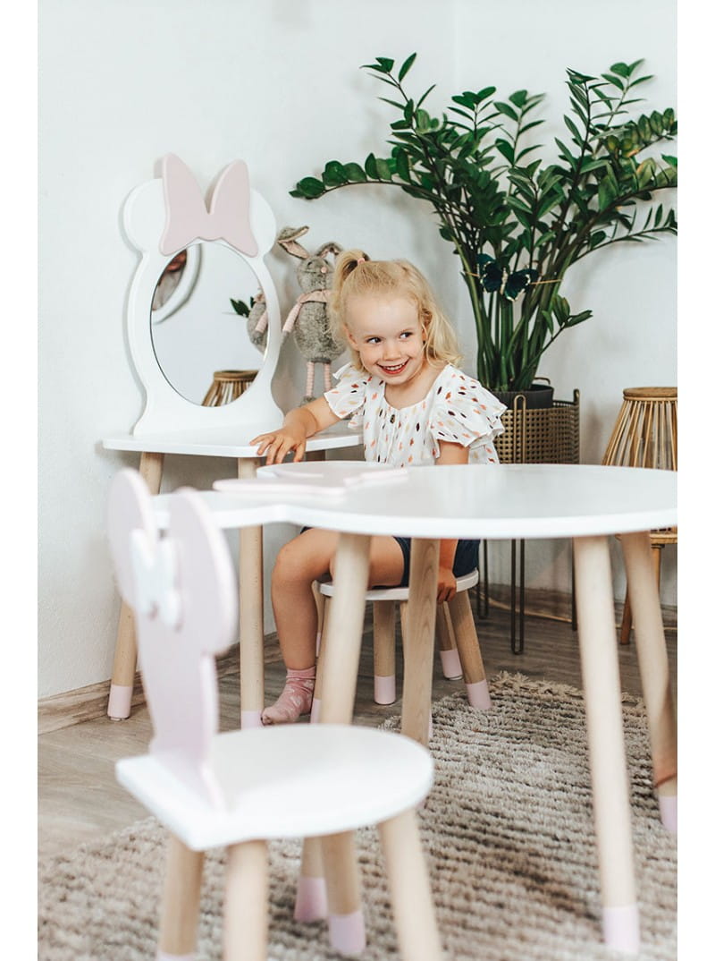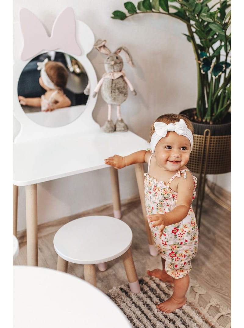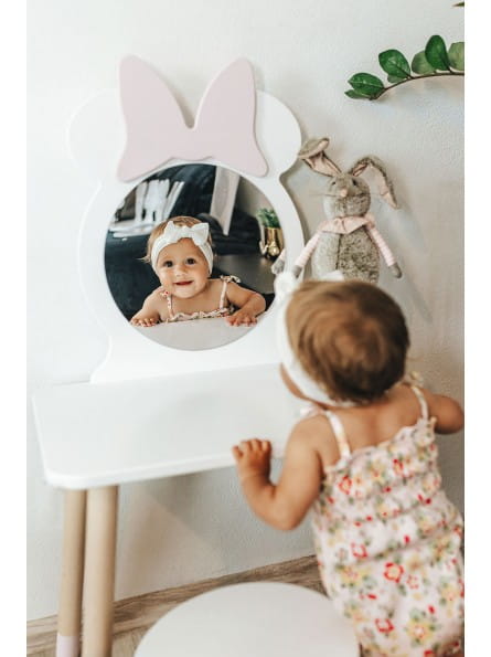 to wyjątkowy i niezwykle uroczy dodatek, który doskonale pasuje do pokoju małej dziewczynki. Lusterko umieszczone w myszce Minnie z uroczą kokardką nadaje całemu zestawowi nie tylko funkcjonalności, ale także wyjątkowego uroku estetycznego. Taborecik, będący integralną częścią zestawu, nie tylko zapewnia komfortowe siedzisko, ale także stanowi uroczy element dekoracyjny. Ta toaletka jest doskonałym pomysłem dla dziewczynek zainteresowanych modą i dbaniem o swój wygląd. Jest to miejsce, które nie tylko służy do codziennej pielęgnacji, ale również inspiruje do eksperymentowania z różnymi stylami oraz rozwijania kreatywności w kreowaniu własnego wizerunku.