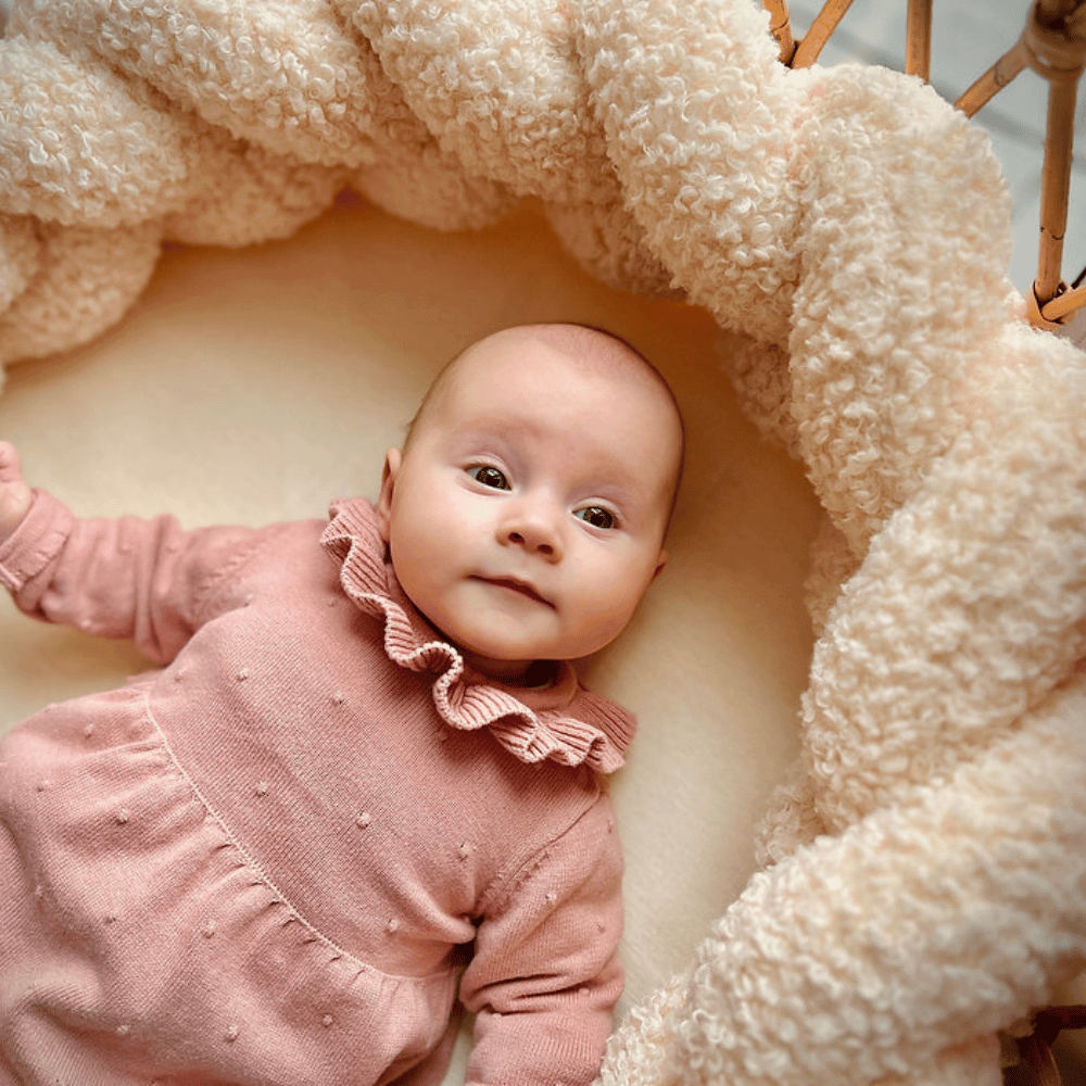 to wyjątkowy ochraniacz do łóżeczka, który łączy bezpieczeństwo, komfort i ponadczasową estetykę. Wykonany z wysokiej jakości dzianiny pętelkowej Boucle, zachwyca strukturą inspirowaną delikatnością jagnięcego futra. Charakterystyczne pętelki tworzą miękką, przyjemną w dotyku powierzchnię o subtelnie szorstkiej fakturze, co nadaje warkoczowi niezwykle przytulny, naturalny wygląd i wyjątkowe wrażenia sensoryczne.